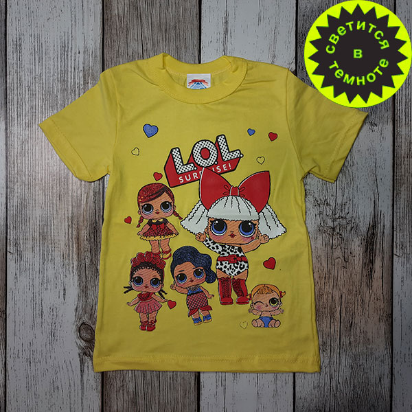 Купить детскую футболку в желтом цвете "Лол", рисунок которой светится в темноте, можно в интернет-магазине "Обновочка".