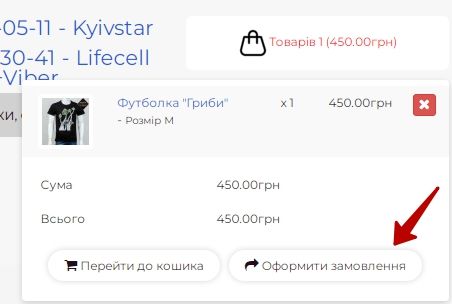 У правому верхньому кутку в кошику з'явиться кількість і вартість замовлених Вами товарів. Потрібно клацнути по ньому мишкою, після чого натиснути на кнопку «Оформити замовлення».