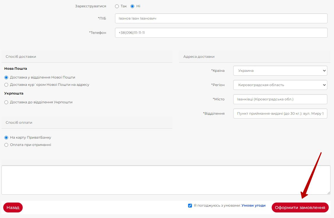 Після заповнення всіх полів, потрібно натиснути на кнопку «Оформити замовлення».