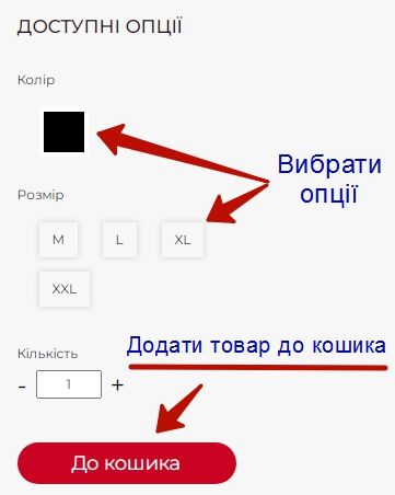 Щоб зробити замовлення, потрібно зайти на сторінку з товаром, вибрати доступні опції, якщо такі є, після чого натиснути на кнопку «До кошика».