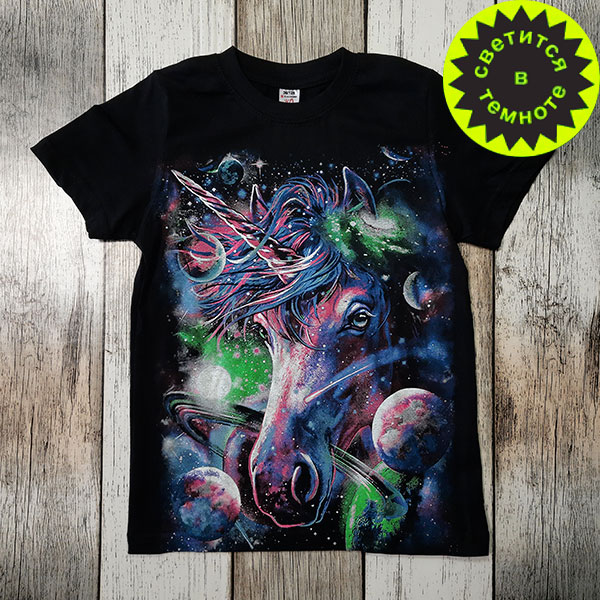 Купити підліткову футболку "Єдиноріг", малюнок якої світиться в темряві, можна в інтернет-магазині "Обновочка".
